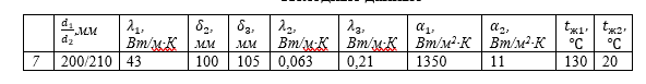 Стальная труба диаметром с коэффициентом теплопроводности покрыта изоляцией в два слоя толщиной и с коэффициентами теплопроводности и . Внутри трубы протекает вода со средней температурой , а температура окружающей среды - . Коэффициенты теплоотдачи от воды к стенке трубы - , а от внешней поверхности изоляции к воздуху - . Определить тепловые потери с единицы длины трубопровода и температуры на границах слоев. Как изменится величина тепловых потерь с 1 м трубопровода, если слои изоляции поменять местами?