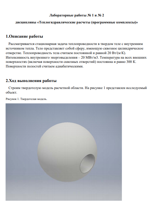 Описание работы Рассматривается стационарная задача теплопроводности в твердом теле с внутренним источником тепла. Тело представляет собой сферу, имеющую сквозное цилиндрическое отверстие. Теплопроводность тела считаем постоянной и равной 20 Вт/(м∙К). Интенсивность внутреннего энерговыделения – 20 МВт/м3. Температура на всех внешних поверхностях (включая поверхности сквозных отверстий) постоянна и равно 300 К. Поверхности полостей считаем адиабатическими.