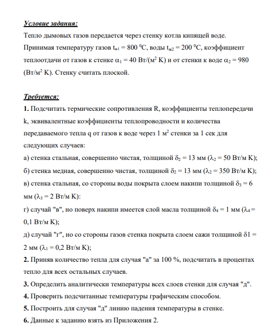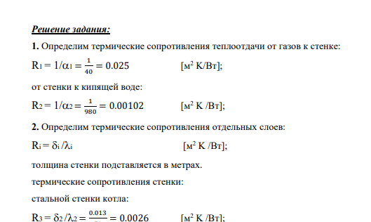 Условие задания: Тепло дымовых газов передается через стенку котла кипящей воде. Принимая температуру газов tж1 = 800 0 C, воды tж2 = 200 0 C, коэффициент теплоотдачи от газов к стенке α1 = 40 Вт/(м2 K) и от стенки к воде α2 = 980 (Вт/м2 K). Стенку считать плоской.