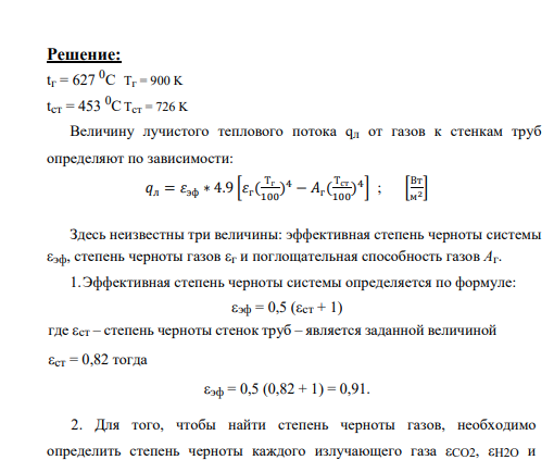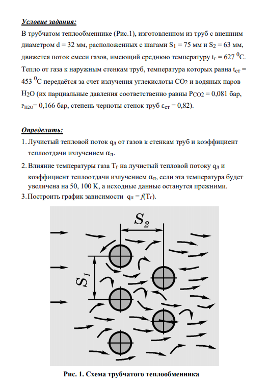 Условие задания: В трубчатом теплообменнике (Рис.1), изготовленном из труб с внешним диаметром d = 32 мм, расположенных с шагами S1 = 75 мм и S2 = 63 мм, движется поток смеси газов, имеющий среднюю температуру tг = 627 0 С. Тепло от газа к наружным стенкам труб, температура которых равна tст = 453 0 С передаётся за счет излучения углекислоты CO2 и водяных паров H2O (их парциальные давления соответственно равны PCO2 = 0,081 бар, PH2O= 0,166 бар, степень черноты стенок труб εст = 0,82)