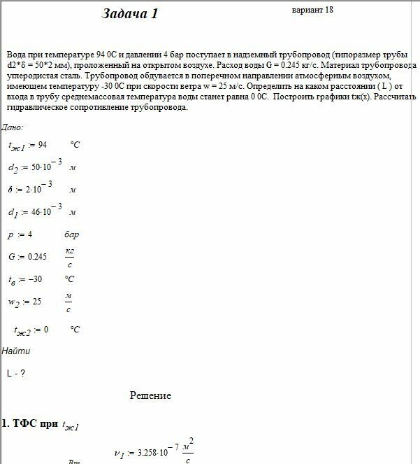 Вода при температуре 94 0С и давлении 4 бар поступает в надземный трубопровод (типоразмер трубы d2*δ = 50*2 мм), проложенный на открытом воздухе. Расход воды G = 0.245 кг/с. Материал трубопровода углеродистая сталь. Трубопровод обдувается в поперечном направлении атмосферным воздухом, имеющем температуру -30 0С при скорости ветра w = 25 м/с. Определить на каком расстоянии ( L ) от входа в трубу среднемассовая температура воды станет равна 0 0С. Построить графики tж(х). Рассчитать гидравлическое сопротивление трубопровода