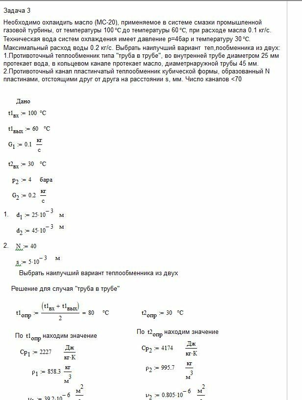 Необходимо охлаидить масло (МС-20), применяемое в системе смазки промышленной газовой турбины, от температуры 100 до температуры 60, при расходе масла 0.1 кг/с. Техническая вода систем охлаждения имеет давление p=4бар и температуру 30. Максимальный расход воды 0.2 кг/с. Выбрать наилучший вариант теп,лообменника из двух: 1.Противоточный теплообменник типа "труба в трубе", во внутренней трубе диаметром 25 мм протекает вода, в кольцевом канале протекает масло, диаметрнаружной трубы 45 мм. 2.Противоточный канал пластинчатый теплообменник кубической формы, образованный N пластинами, отстоящими друг от друга на расстоянии s, мм. Число каналов <70