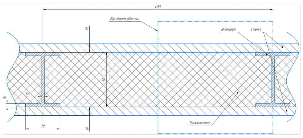 В слое теплоизоляции с шагом B установлены шпангоуты двутаврового сечения, все элементы которых имеют толщину δшп. Шпангоуты установлены таким образом, что занимают всю высоту сечения слоя и своими полками прилегают без зазора к обоим наружным слоям стенки. Ширина шпангоутов составляет b.