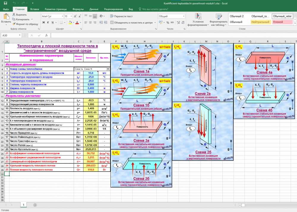Коэффициент теплоотдачи поверхность — воздух - Excel для расчета параметров