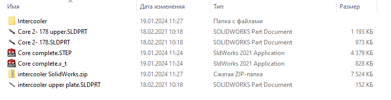 Intercooler with a working core made in SolidWorks. The intercooler is modeled internally. A model was made in SolidWorks, and a universal Step version of the model and a Parasolid .x_t version were created.