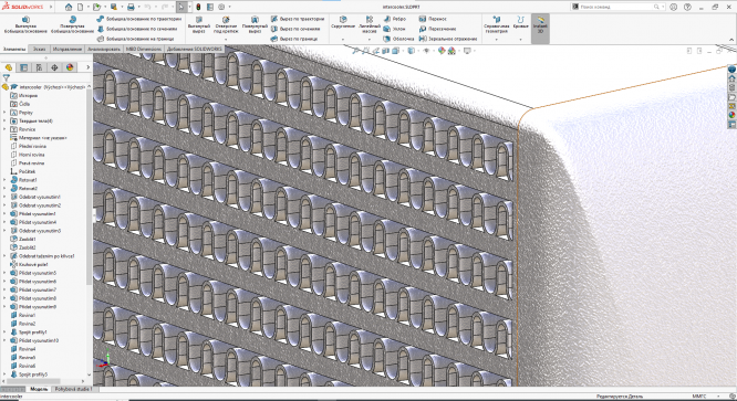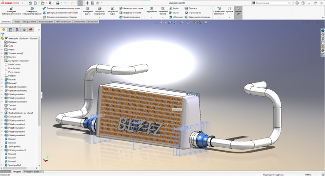 Intercooler with a working core made in SolidWorks. The intercooler is modeled internally. A model was made in SolidWorks, and a universal Step version of the model and a Parasolid .x_t version were created.