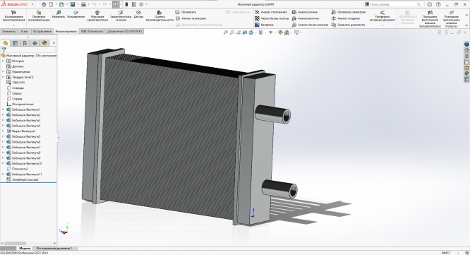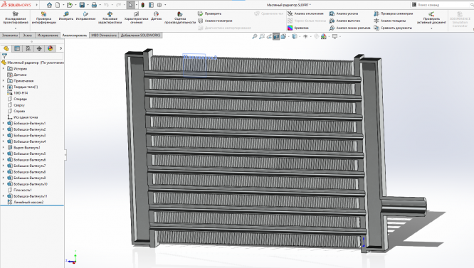 Радиатор для масла автомобильный Масло-Воздух. Габариты ядра 200х175х40. 3D модель для расчетов полностью смоделирована в SolidWorks. Также сохранена в Step и Parasolid .x_t