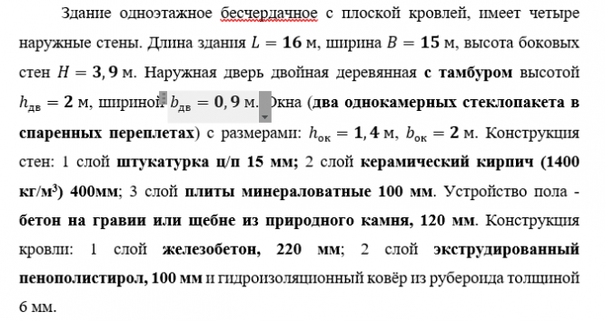 Здание одноэтажное бесчердачное с плоской кровлей, имеет четыре наружные стены. Длина здания L=16 м, ширина B=15 м, высота боковых стен H=3,9 м. Наружная дверь двойная деревянная с тамбуром высотой h_дв=2 м, шириной b_дв=0,9 м. Окна (два однокамерных стеклопакета в спаренных переплетах) с размерами: h_ок=1,4 м, b_ок=2 м. Конструкция стен: 1 слой штукатурка ц/п 15 мм; 2 слой керамический кирпич (1400 кг/м3) 400мм; 3 слой плиты минераловатные 100 мм. Устройство пола - бетон на гравии или щебне из природного камня, 120 мм. Конструкция кровли: 1 слой железобетон, 220 мм; 2 слой экструдированный пенополистирол, 100 мм и гидроизоляционный ковёр из рубероида толщиной 6 мм. .