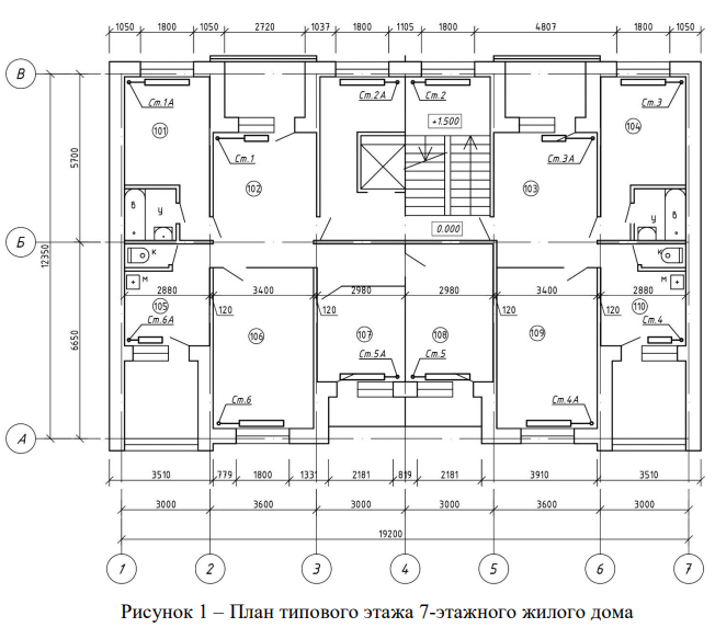 1. Регион строительства – г. Санкт-Петербург 2. Вариант конструкции наружной стены – из тяжелого бетона 120 мм, пенополистирол 100 мм, защитный слой из кирпича 120 мм. 3. Вариант конструкции пола – ж/б плита, утеплитель минвата с высокой плотностью 120 мм, бетонная стяжка с армированием 70 мм, выравнивающий слой 8 мм, пароизоляционный слой, ламинат 9 мм. 4. Вариант конструкции чердачного покрытия – пустотная плита, пароизоляционный слой, утеплитель – минвата 120 мм, бетонная стяжка с армированием 60 мм, кровля профнастил. 5. Этажность жилого дома – 7