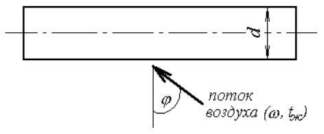 Определите коэффициент теплоотдачи для трубы, омываемой поперечным потоком воздуха, если наружный диаметр трубы d, мм, температура воздуха tж, °С, скорость ω (м/с) и угол атаки φ, град имеют значения, приведенные в таблице, а характеристики сухого воз-духа – в таблице 2.2.