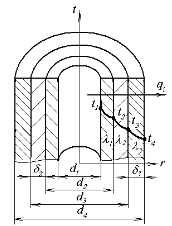 Расчетная схема паропровода Толщина первого слоя изоляции δ2, второго – δ3, мм. Коэффициенты теплопроводности изолируемой трубы и слоев изоляции соответственно равны λ1, λ2, λ3, Вт/(м·К). Температура внутренней и внешней поверхностей паропровода соответственно t1 и t4, °С. Определите тепловые потери одного метра длины трубопровода ql, Вт/м и температуры на поверхностях раздела отдельных слоев t2 и t3, °С. Остальные исходные данные приведены в таблице.