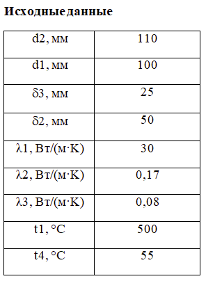 Толщина первого слоя изоляции δ2, второго – δ3, мм. Коэффициенты теплопроводности изолируемой трубы и слоев изоляции соответственно равны λ1, λ2, λ3, Вт/(м·К). Температура внутренней и внешней поверхностей паропровода соответственно t1 и t4, °С. Определите тепловые потери одного метра длины трубопровода ql, Вт/м и температуры на поверхностях раздела отдельных слоев t2 и t3, °С. Остальные исходные данные приведены в таблице.