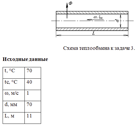 По трубе внутренним диаметром d, мм и длиной L, м протекает вода со скоростью ω м/с. Средняя температура воды – t, °С, а внутренней стенки трубы – tс, °С. Определите коэффициент теплоотдачи от воды к стенке трубы и передаваемый тепловой поток.