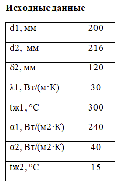 литовой изоляции толщиной δ2, мм. Коэффициенты теплопроводности материала трубы λ1, изоляции λ2= 0,1 Вт/(м·К). Температуры пара tж1 и окружающего воздуха tж2, °С. Требуется определить линейный коэффициент теплопередачи kl, Вт/(м2·K), линейную плотность теплового потока ql, Вт/м и температуру наружной поверхности паропровода t3, °С. Исходные данные приведены в таблице.