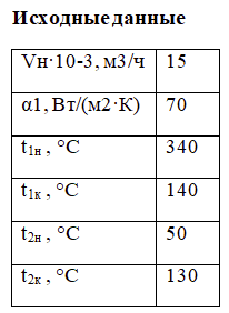 Объемный расход топочных газов при нормальных условиях Vн, м3/ч, средний коэффициент теплоотдачи от воздуха к поверхности нагрева α1, Вт/(м2·К), от поверхности нагрева к воде α2 = 500 Вт/(м2·К), коэффициент теплопроводности материала стенки трубы (стали) λ = 50 Вт/(м·К), начальные и конечные температуры газа и воды равны соответственно t 1.н, t 1.к , t 2.н и t 2.к ,°С, теплоемкость топочных газов сг = 1,15 кДж/(кг·К), плотность ρг = 1,23 кг/м3. Определите также расход воды G, кг/ч через теплообменник. Изобразите график изменения температур теплоносителей для обеих схем. Исходные данные для расчета приведены в таблице.