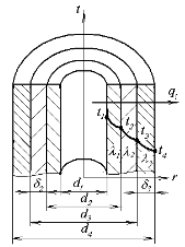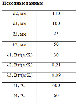 Толщина первого слоя изоляции δ2, второго – δ3, мм. Коэффициенты теплопроводности изолируемой трубы и слоев изоляции соответственно равны λ1, λ2, λ3, Вт/(м·К). Температура внутренней и внешней поверхностей паропровода соответственно t1 и t4, °С. Определите тепловые потери одного метра длины трубопровода ql, Вт/м и температуры на поверхностях раздела отдельных слоев t2 и t3, °С. Остальные исходные данные приведены в таблице.