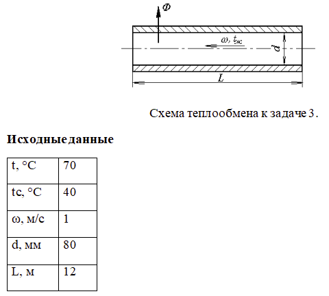 Задача 3 По трубе внутренним диаметром d, мм и длиной L, м протекает вода со скоростью ω м/с. Средняя температура воды – t, °С, а внутренней стенки трубы – tс, °С. Определите коэффициент теплоотдачи от воды к стенке трубы и передаваемый тепловой поток.