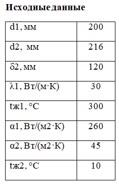 Паропровод диаметром d2/d1 покрыт слоем совелитовой изоляции толщиной δ2, мм. Коэффициенты теплопроводности материала трубы λ1, изоляции λ2= 0,1 Вт/(м·К). Температуры пара tж1 и окружающего воздуха tж2, °С. Требуется определить линейный коэффициент теплопередачи kl, Вт/(м2·K), линейную плотность теплового потока ql, Вт/м и температуру наружной поверхности паропровода t3, °С. Исходные данные приведены в таблице.