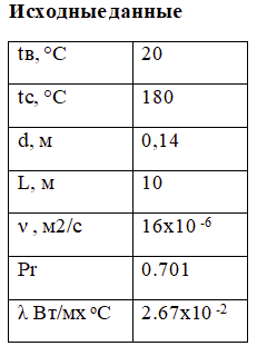 Горизонтальная труба длиной L, м и наружным диаметром d, м расположена в помещении, температура воздуха в котором tв, °С. Средняя температура поверхности трубы tс, °С. Определите величину коэффициента теплоотдачи от трубы к воздуху, а также тепловой поток, теряемый трубой.