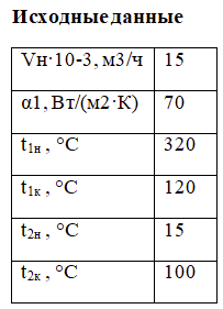 Объемный расход топочных газов при нормальных условиях Vн, м3/ч, средний коэффициент теплоотдачи от воздуха к поверхности нагрева α1, Вт/(м2·К), от поверхности нагрева к воде α2 = 500 Вт/(м2·К), коэффициент теплопроводности материала стенки трубы (стали) λ = 50 Вт/(м·К), начальные и конечные температуры газа и воды равны соответственно t 1.н, t 1.к , t 2.н и t 2.к ,°С, теплоемкость топочных газов сг = 1,15 кДж/(кг·К), плотность ρг = 1,23 кг/м3. Определите также расход воды G, кг/ч через теплообменник. Изобразите график изменения температур теплоносителей для обеих схем. Исходные данные для расчета приведены в таблице.