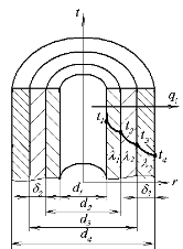 Расчетная схема паропровода Толщина первого слоя изоляции δ2, второго – δ3, мм. Коэффициенты теплопроводности изолируемой трубы и слоев изоляции соответственно равны λ1, λ2, λ3, Вт/(м·К). Температура внутренней и внешней поверхностей паропровода соответственно t1 и t4, °С. Определите тепловые потери одного метра длины трубопровода ql, Вт/м и температуры на поверхностях раздела отдельных слоев t2 и t3, °С. Остальные исходные данные приведены в таблице.