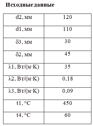 Толщина первого слоя изоляции δ2, второго – δ3, мм. Коэффициенты теплопроводности изолируемой трубы и слоев изоляции соответственно равны λ1, λ2, λ3, Вт/(м·К). Температура внутренней и внешней поверхностей паропровода соответственно t1 и t4, °С. Определите тепловые потери одного метра длины трубопровода ql, Вт/м и температуры на поверхностях раздела отдельных слоев t2 и t3, °С. Остальные исходные данные приведены в таблице.