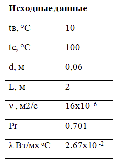 Горизонтальная труба длиной L, м и наружным диаметром d, м расположена в помещении, температура воздуха в котором tв, °С. Средняя температура поверхности трубы tс, °С. Определите величину коэффициента теплоотдачи от трубы к воздуху, а также тепловой поток, теряемый трубой.
