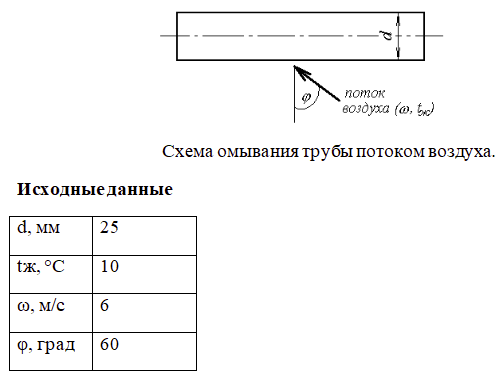 Определите коэффициент теплоотдачи для трубы, омываемой поперечным потоком воздуха, если наружный диаметр трубы d, мм, температура воздуха tж, °С, скорость ω (м/с) и угол атаки φ, град имеют значения, приведенные в таблице, а характеристики сухого воз-духа – в таблице 2.2.