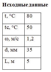 По трубе внутренним диаметром d, мм и длиной L, м протекает вода со скоростью ω м/с. Средняя температура воды – t, °С, а внутренней стенки трубы – tс, °С. Определите коэффициент теплоотдачи от воды к стенке трубы и передаваемый тепловой поток.