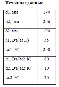теплопроводности материала трубы λ1, изоляции λ2= 0,1 Вт/(м·К). Температуры пара tж1 и окружающего воздуха tж2, °С. Требуется определить линейный коэффициент теплопередачи kl, Вт/(м2·K), линейную плотность теплового потока ql, Вт/м и температуру наружной поверхности паропровода t3, °С. Исходные данные приведены в таблице.