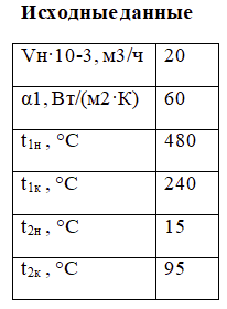 Объемный расход топочных газов при нормальных условиях Vн, м3/ч, средний коэффициент теплоотдачи от воздуха к поверхности нагрева α1, Вт/(м2·К), от поверхности нагрева к воде α2 = 500 Вт/(м2·К), коэффициент теплопроводности материала стенки трубы (стали) λ = 50 Вт/(м·К), начальные и конечные температуры газа и воды равны соответственно t 1.н, t 1.к , t 2.н и t 2.к ,°С, теплоемкость топочных газов сг = 1,15 кДж/(кг·К), плотность ρг = 1,23 кг/м3. Определите также расход воды G, кг/ч через теплообменник. Изобразите график изменения температур теплоносителей для обеих схем. Исходные данные для расчета приведены в таблице.