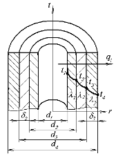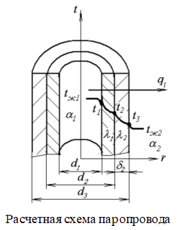 Расчетная схема паропровода Толщина первого слоя изоляции δ2, второго – δ3, мм. Коэффициенты теплопроводности изолируемой трубы и слоев изоляции соответственно равны λ1, λ2, λ3, Вт/(м·К). Температура внутренней и внешней поверхностей паропровода соответственно t1 и t4, °С. Определите тепловые потери одного метра длины трубопровода ql, Вт/м и температуры на поверхностях раздела отдельных слоев t2 и t3, °С. Остальные исходные данные приведены в таблице.