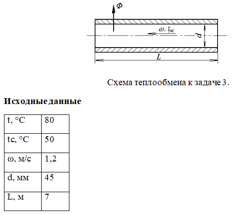 Задача 3 По трубе внутренним диаметром d, мм и длиной L, м протекает вода со скоростью ω м/с. Средняя температура воды – t, °С, а внутренней стенки трубы – tс, °С. Определите коэффициент теплоотдачи от воды к стенке трубы и передаваемый тепловой поток.