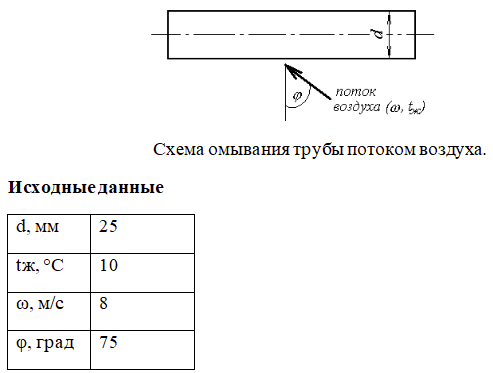 Определите коэффициент теплоотдачи для трубы, омываемой поперечным потоком воздуха, если наружный диаметр трубы d, мм, температура воздуха tж, °С, скорость ω (м/с) и угол атаки φ, град имеют значения, приведенные в таблице, а характеристики сухого воз-духа – в таблице 2.2.
