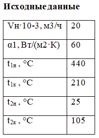 Объемный расход топочных газов при нормальных условиях Vн, м3/ч, средний коэффициент теплоотдачи от воздуха к поверхности нагрева α1, Вт/(м2·К), от поверхности нагрева к воде α2 = 500 Вт/(м2·К), коэффициент теплопроводности материала стенки трубы (стали) λ = 50 Вт/(м·К), начальные и конечные температуры газа и воды равны соответственно t 1.н, t 1.к , t 2.н и t 2.к ,°С, теплоемкость топочных газов сг = 1,15 кДж/(кг·К), плотность ρг = 1,23 кг/м3. Определите также расход воды G, кг/ч через теплообменник. Изобразите график изменения температур теплоносителей для обеих схем. Исходные данные для расчета приведены в таблице.