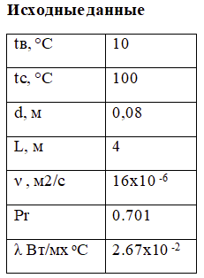 Горизонтальная труба длиной L, м и наружным диаметром d, м расположена в помещении, температура воздуха в котором tв, °С. Средняя температура поверхности трубы tс, °С. Определите величину коэффициента теплоотдачи от трубы к воздуху, а также тепловой поток, теряемый трубой.