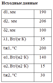 Паропровод диаметром d2/d1 покрыт слоем совелитовой изоляции толщиной δ2, мм. Коэффициенты теплопроводности материала трубы λ1, изоляции λ2= 0,1 Вт/(м·К). Температуры пара tж1 и окружающего воздуха tж2, °С. Требуется определить линейный коэффициент теплопередачи kl, Вт/(м2·K), линейную плотность теплового потока ql, Вт/м и температуру наружной поверхности паропровода t3, °С. Исходные данные приведены в таблице.