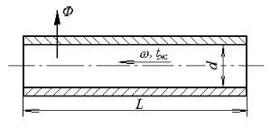 По трубе внутренним диаметром d, мм и длиной L, м протекает вода со скоростью w, м/с (рис. 2.3). Средняя температура воды – t, °С , а внутренней стенки трубы – tс, °С. Определите коэффициент теплоотдачи от воды к стенке трубы и передаваемый тепловой поток. Исходные данные приведены в таблицах 2.4, 2.5.