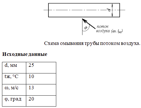 Определите коэффициент теплоотдачи для трубы, омываемой поперечным потоком воздуха, если наружный диаметр трубы d, мм, температура воздуха tж, °С, скорость ω (м/с) и угол атаки φ, град имеют значения, приведенные в таблице, а характеристики сухого воз-духа – в таблице 2.2.
