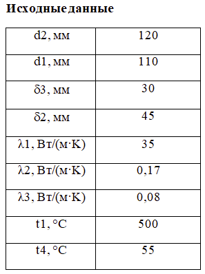 Толщина первого слоя изоляции δ2, второго – δ3, мм. Коэффициенты теплопроводности изолируемой трубы и слоев изоляции соответственно равны λ1, λ2, λ3, Вт/(м·К). Температура внутренней и внешней поверхностей паропровода соответственно t1 и t4, °С. Определите тепловые потери одного метра длины трубопровода ql, Вт/м и температуры на поверхностях раздела отдельных слоев t2 и t3, °С. Остальные исходные данные приведены в таблице.