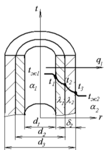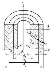 Расчетная схема паропровода Толщина первого слоя изоляции δ2, второго – δ3, мм. Коэффициенты теплопроводности изолируемой трубы и слоев изоляции соответственно равны λ1, λ2, λ3, Вт/(м·К). Температура внутренней и внешней поверхностей паропровода соответственно t1 и t4, °С. Определите тепловые потери одного метра длины трубопровода ql, Вт/м и температуры на поверхностях раздела отдельных слоев t2 и t3, °С. Остальные исходные данные приведены в таблице.