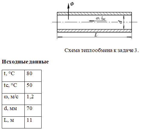 По трубе внутренним диаметром d, мм и длиной L, м протекает вода со скоростью ω м/с. Средняя температура воды – t, °С, а внутренней стенки трубы – tс, °С. Определите коэффициент теплоотдачи от воды к стенке трубы и передаваемый тепловой поток.
