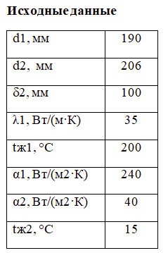 литовой изоляции толщиной δ2, мм. Коэффициенты теплопроводности материала трубы λ1, изоляции λ2= 0,1 Вт/(м·К). Температуры пара tж1 и окружающего воздуха tж2, °С. Требуется определить линейный коэффициент теплопередачи kl, Вт/(м2·K), линейную плотность теплового потока ql, Вт/м и температуру наружной поверхности паропровода t3, °С. Исходные данные приведены в таблице.