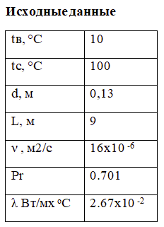 Горизонтальная труба длиной L, м и наружным диаметром d, м расположена в помещении, температура воздуха в котором tв, °С. Средняя температура поверхности трубы tс, °С. Определите величину коэффициента теплоотдачи от трубы к воздуху, а также тепловой поток, теряемый трубой.
