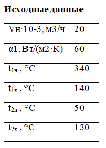 Объемный расход топочных газов при нормальных условиях Vн, м3/ч, средний коэффициент теплоотдачи от воздуха к поверхности нагрева α1, Вт/(м2·К), от поверхности нагрева к воде α2 = 500 Вт/(м2·К), коэффициент теплопроводности материала стенки трубы (стали) λ = 50 Вт/(м·К), начальные и конечные температуры газа и воды равны соответственно t 1.н, t 1.к , t 2.н и t 2.к ,°С, теплоемкость топочных газов сг = 1,15 кДж/(кг·К), плотность ρг = 1,23 кг/м3. Определите также расход воды G, кг/ч через теплообменник. Изобразите график изменения температур теплоносителей для обеих схем. Исходные данные для расчета приведены в таблице.