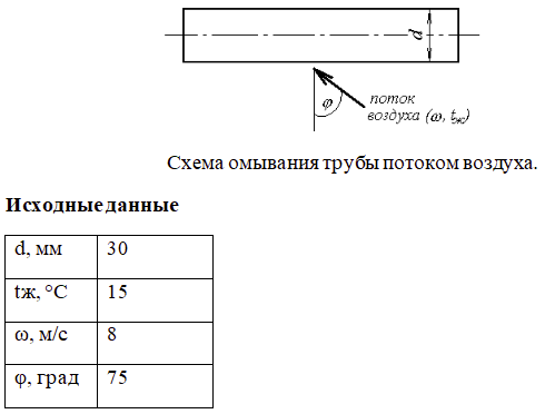 Определите коэффициент теплоотдачи для трубы, омываемой поперечным потоком воздуха, если наружный диаметр трубы d, мм, температура воздуха tж, °С, скорость ω (м/с) и угол атаки φ, град имеют значения, приведенные в таблице, а характеристики сухого воз-духа – в таблице 2.2.