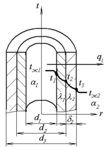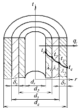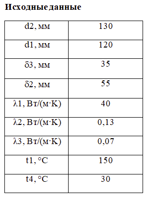 Толщина первого слоя изоляции δ2, второго – δ3, мм. Коэффициенты теплопроводности изолируемой трубы и слоев изоляции соответственно равны λ1, λ2, λ3, Вт/(м·К). Температура внутренней и внешней поверхностей паропровода соответственно t1 и t4, °С. Определите тепловые потери одного метра длины трубопровода ql, Вт/м и температуры на поверхностях раздела отдельных слоев t2 и t3, °С. Остальные исходные данные приведены в таблице.