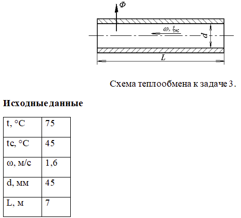 Задача 3 По трубе внутренним диаметром d, мм и длиной L, м протекает вода со скоростью ω м/с. Средняя температура воды – t, °С, а внутренней стенки трубы – tс, °С. Определите коэффициент теплоотдачи от воды к стенке трубы и передаваемый тепловой поток.