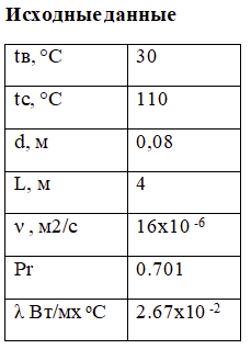 Горизонтальная труба длиной L, м и наружным диаметром d, м расположена в помещении, температура воздуха в котором tв, °С. Средняя температура поверхности трубы tс, °С. Определите величину коэффициента теплоотдачи от трубы к воздуху, а также тепловой поток, теряемый трубой.