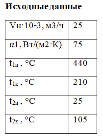 Объемный расход топочных газов при нормальных условиях Vн, м3/ч, средний коэффициент теплоотдачи от воздуха к поверхности нагрева α1, Вт/(м2·К), от поверхности нагрева к воде α2 = 500 Вт/(м2·К), коэффициент теплопроводности материала стенки трубы (стали) λ = 50 Вт/(м·К), начальные и конечные температуры газа и воды равны соответственно t 1.н, t 1.к , t 2.н и t 2.к ,°С, теплоемкость топочных газов сг = 1,15 кДж/(кг·К), плотность ρг = 1,23 кг/м3. Определите также расход воды G, кг/ч через теплообменник. Изобразите график изменения температур теплоносителей для обеих схем. Исходные данные для расчета приведены в таблице.